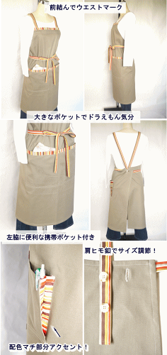 日本サイズの9号です 商品創りコンセプト 普段着もお洒落で楽しい毎日を イメージしてデザインをしています 大人可愛いアイテムを中心に カフェエプロン・エプロンドレスなど いろんなサイズ の方に 動きやすく、着易いデザインを フリーサイズで提案します ジャ ケット・ボトムなどに使われる素材を使い 上質で洗濯機洗いによるダメージの少ない縫製 丈夫な縫い目、裁ち切りを見せない丁寧な仕様 オリジナル・ハンドメイドの魅力 工場直接出荷だからできるサービス お直し、サイズオーダー詳細はコチラ丈夫な帆布とストライプ組み合わせ *H型*ベージュエプロン ・ポケットの深さはすっぽり手が入り、単行本も楽に入ります ・左脇に便利な携帯ポケット付 ・綿インテリア11号帆布使用、かなり丈夫な素材です ・両肩ヒモ釦でサイズ調節できるH型エプロン いつもオシャレで可愛いの為に ナチュラルベージュと可愛いストライプ *モニターによって実際の色と異なる場合があります。