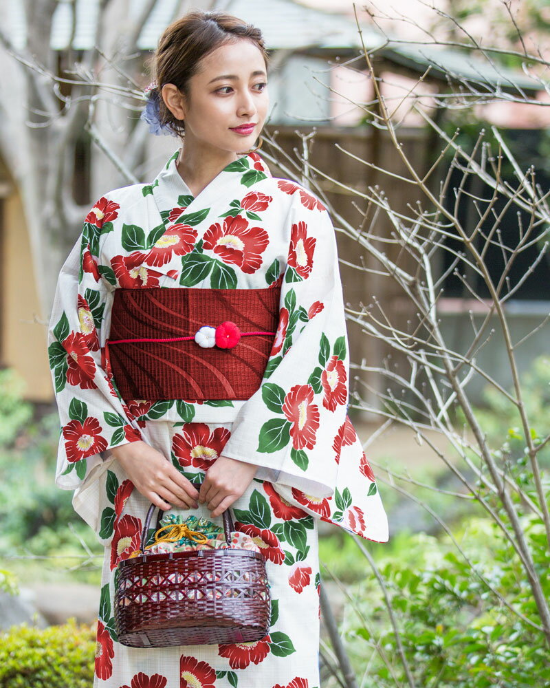 浴衣 レディース 3点セット(浴衣/帯/下駄) 赤 エンジ 緑 椿 牡丹 つばき ボタン レトロモダン レトロ フリーサイズ