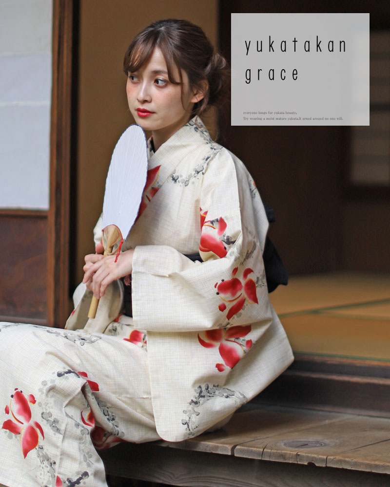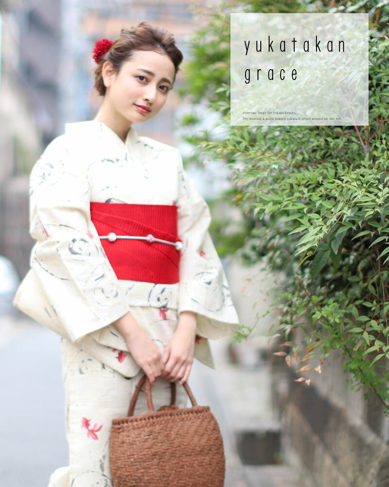 浴衣 レディース 3点セット(浴衣/帯/下駄) ベージュ 赤 金魚 きんぎょ 波紋 レトロ レトロモダン フリーサイズ
