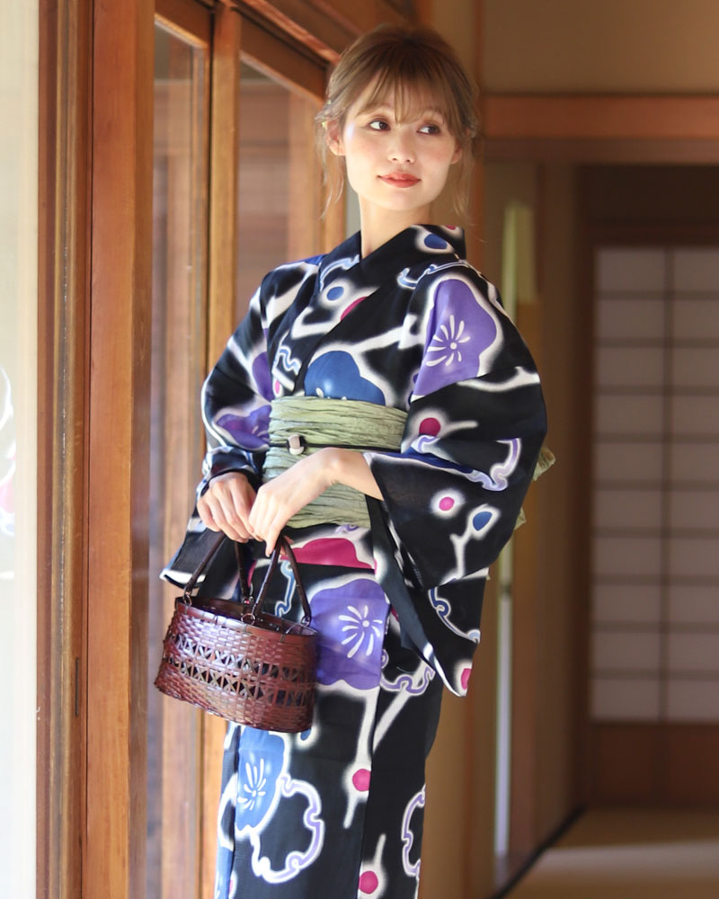 浴衣 レディース 3点セット(浴衣/帯/下駄) 黒 ブラック 紺 ネイビー 紫 パープル ピンク 緑 グリン 梅 雪輪模様 花柄