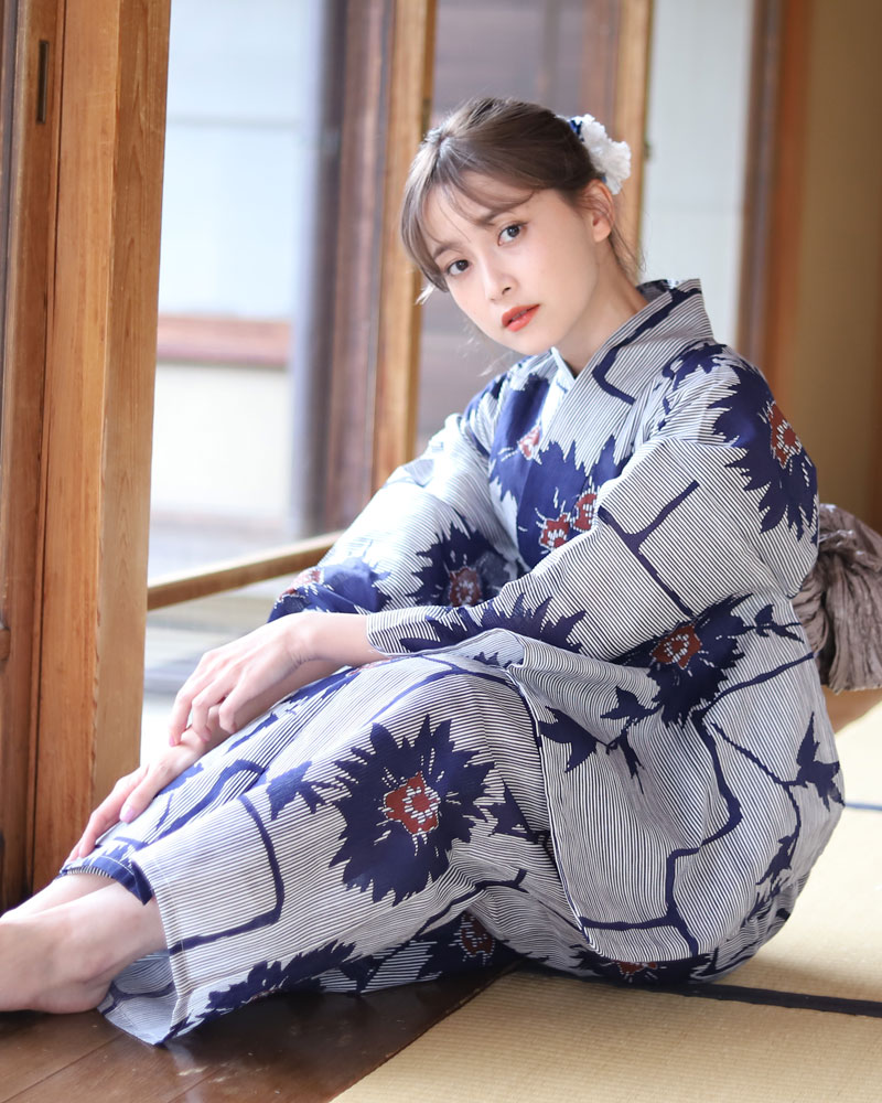 浴衣 レディース 3点セット(浴衣/帯/下駄) グレー 紺 ネイビー 赤 縞 ストライプ 菊 花柄