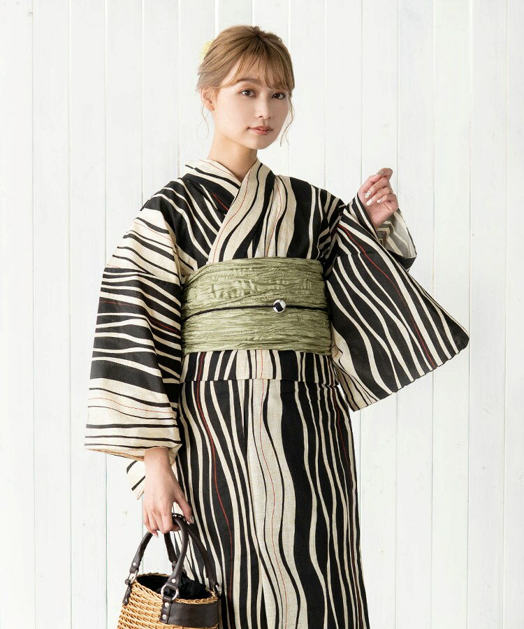 浴衣 レディース 3点セット(浴衣/帯/下駄) 黒 ベージュ 縞 波線 レトロ レトロモダン フリーサイズ