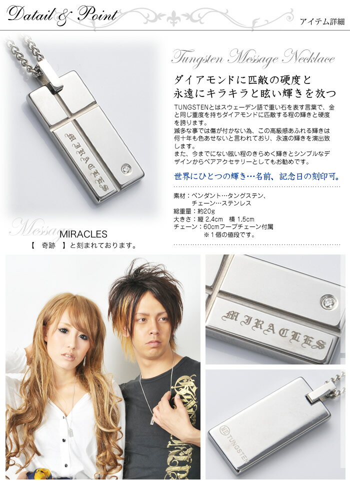 滅多な事では傷が付かない為,この高級感あふれる眩い輝きは何十年も色あせないともいわれております ■チェーン部分には体に優しい高級素材チタンチェーンを使用 金属アレルギーもほとんどなく、錆びずお手入れも簡単、とても軽い金属で長時間着けても気にならず着けごごち抜群で野球、スポーツ選手などアスリートに人気 ■裏面に名前 記念日 メッセージの刻印出来ます 刻印内容は注文を進んで頂き【備考欄】にご記入下さい ※裏面の刻印場所は当店がバランスを見て刻印させて頂きます 【例】2013 . 12 . 24 Takuya & Misaki ■素材 ペンダント: タングステン チェーン: チタンチェーン ■付属品 専用ギフケース ギフトバッグ ■ネックレス1個の価格です / メッセージ 刻印 ペアネックレス にも ペアネック にも ペアアクセサリー にも METAL EVOLUTION メタルエボリューション メタルエヴォリューション タングステンアクセサリー チタンチェーン 45cm チタンチェーン 50cm チタン チェーン 60cm /