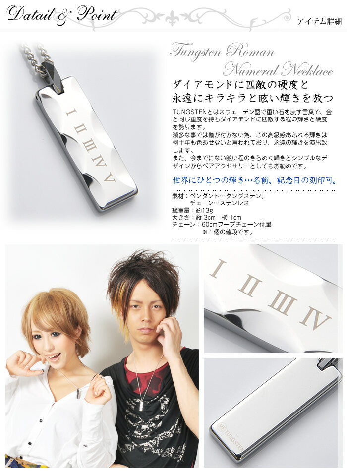 滅多な事では傷が付かない為,この高級感あふれる眩い輝きは何十年も色あせないともいわれております ■チェーン部分には体に優しい高級素材チタンチェーンを使用 金属アレルギーもほとんどなく、錆びずお手入れも簡単、とても軽い金属で長時間着けても気にならず着けごごち抜群で野球、スポーツ選手などアスリートに人気 ■裏面に名前 記念日 メッセージの刻印出来ます 刻印内容は注文を進んで頂き【備考欄】にご記入下さい ※裏面の刻印場所は当店がバランスを見て刻印させて頂きます 【例】2013 . 12 . 24 Takuya & Misaki ■素材 ペンダント: タングステン チェーン: チタンチェーン ■付属品 専用ギフケース ギフトバッグ ■ネックレス1個の価格です / メッセージ 刻印 ペアネックレス にも ペアネック にも ペアアクセサリー にも METAL EVOLUTION メタルエボリューション メタルエヴォリューション タングステンアクセサリー チタンチェーン 45cm チタンチェーン 50cm チタン チェーン 60cm /