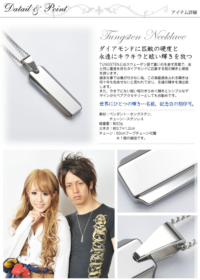 滅多な事では傷が付かない為,この高級感あふれる眩い輝きは何十年も色あせないともいわれております ■チェーン部分には体に優しい高級素材チタンチェーンを使用 金属アレルギーもほとんどなく、錆びずお手入れも簡単、とても軽い金属で長時間着けても気にならず着けごごち抜群で野球、スポーツ選手などアスリートに人気 ■裏面に名前 記念日 メッセージの刻印出来ます 刻印内容は注文を進んで頂き【備考欄】にご記入下さい ※裏面の刻印場所は当店がバランスを見て刻印させて頂きます 【例】2013 . 12 . 24 Takuya & Misaki ■素材 ペンダント: タングステン チェーン: チタンチェーン ■付属品 専用ギフケース ギフトバッグ ■ネックレス1個の価格です / メッセージ 刻印 ペアネックレス にも ペアネック にも ペアアクセサリー にも METAL EVOLUTION メタルエボリューション メタルエヴォリューション タングステンアクセサリー チタンチェーン 45cm チタンチェーン 50cm チタン チェーン 60cm /