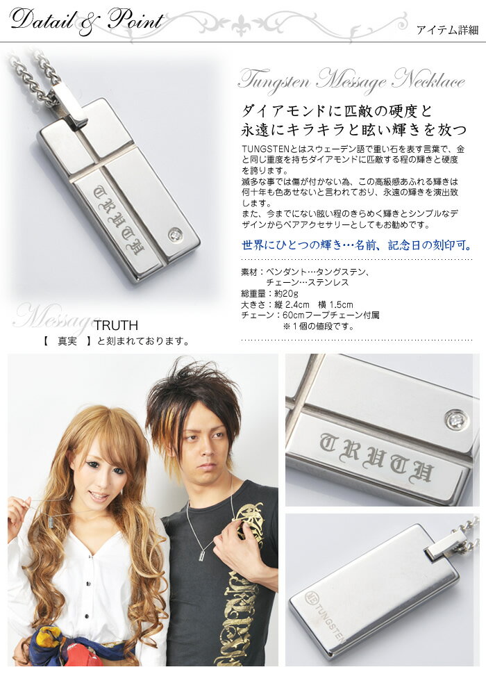 滅多な事では傷が付かない為,この高級感あふれる眩い輝きは何十年も色あせないともいわれております ■チェーン部分には体に優しい高級素材チタンチェーンを使用 金属アレルギーもほとんどなく、錆びずお手入れも簡単、とても軽い金属で長時間着けても気にならず着けごごち抜群で野球、スポーツ選手などアスリートに人気 ■裏面に名前 記念日 メッセージの刻印出来ます 刻印内容は注文を進んで頂き【備考欄】にご記入下さい ※裏面の刻印場所は当店がバランスを見て刻印させて頂きます 【例】2013 . 12 . 24 Takuya & Misaki ■素材 ペンダント: タングステン チェーン: チタンチェーン ■付属品 専用ギフケース ギフトバッグ ■ネックレス1個の価格です / メッセージ 刻印 ペアネックレス にも ペアネック にも ペアアクセサリー にも METAL EVOLUTION メタルエボリューション メタルエヴォリューション タングステンアクセサリー チタンチェーン 45cm チタンチェーン 50cm チタン チェーン 60cm /