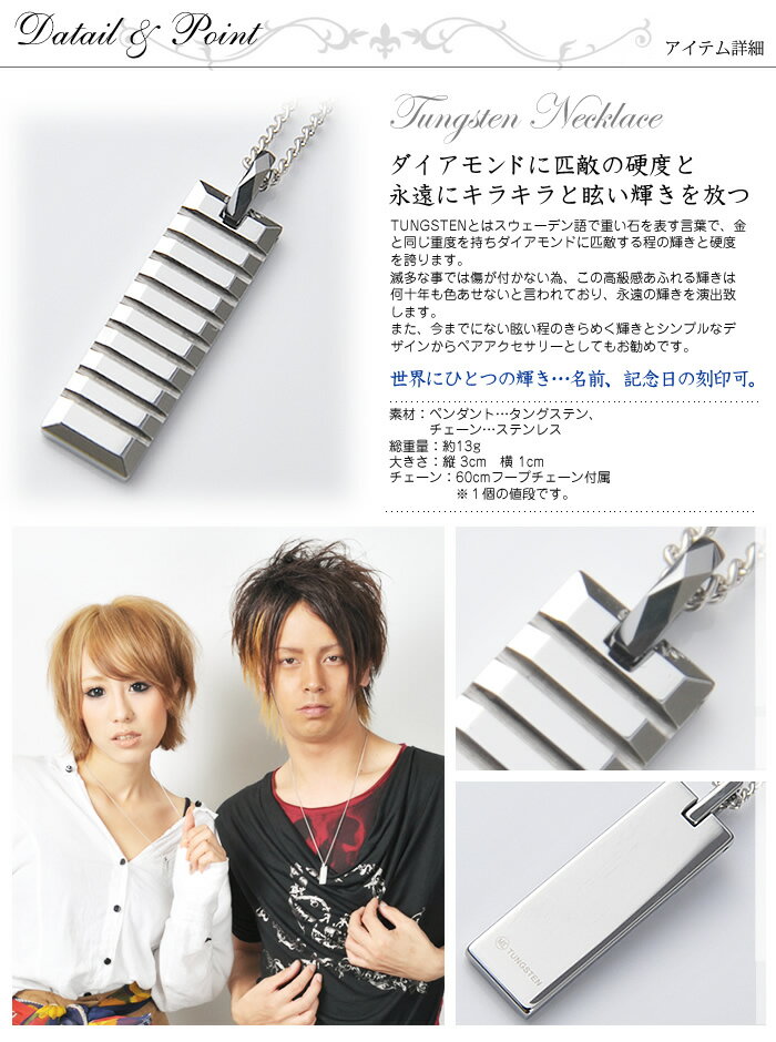 滅多な事では傷が付かない為,この高級感あふれる眩い輝きは何十年も色あせないともいわれております ■チェーン部分には体に優しい高級素材チタンチェーンを使用 金属アレルギーもほとんどなく、錆びずお手入れも簡単、とても軽い金属で長時間着けても気にならず着けごごち抜群で野球、スポーツ選手などアスリートに人気 ■裏面に名前 記念日 メッセージの刻印出来ます 刻印内容は注文を進んで頂き【備考欄】にご記入下さい ※裏面の刻印場所は当店がバランスを見て刻印させて頂きます 【例】2013 . 12 . 24 Takuya & Misaki ■素材 ペンダント: タングステン チェーン: チタンチェーン ■付属品 専用ギフケース ギフトバッグ ■ネックレス1個の価格です / メッセージ 刻印 ペアネックレス にも ペアネック にも ペアアクセサリー にも METAL EVOLUTION メタルエボリューション メタルエヴォリューション タングステンアクセサリー チタンチェーン 45cm チタンチェーン 50cm チタン チェーン 60cm /