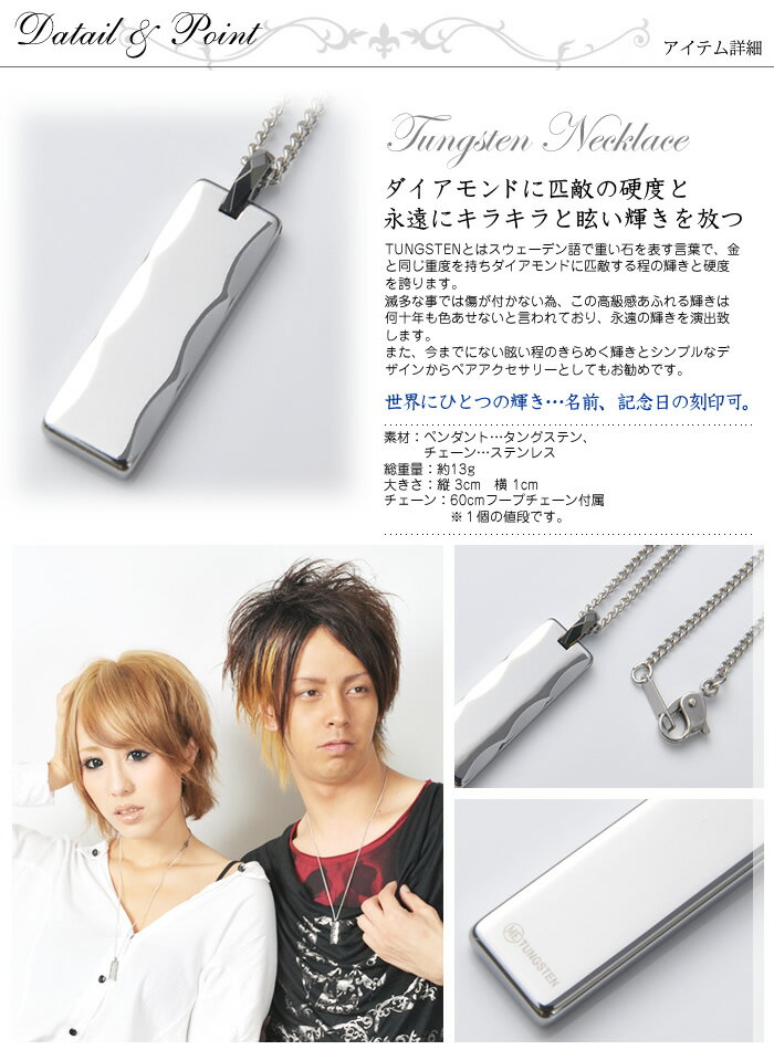 滅多な事では傷が付かない為,この高級感あふれる眩い輝きは何十年も色あせないともいわれております ■チェーン部分には体に優しい高級素材チタンチェーンを使用 金属アレルギーもほとんどなく、錆びずお手入れも簡単、とても軽い金属で長時間着けても気にならず着けごごち抜群で野球、スポーツ選手などアスリートに人気 ■裏面に名前 記念日 メッセージの刻印出来ます 刻印内容は注文を進んで頂き【備考欄】にご記入下さい ※裏面の刻印場所は当店がバランスを見て刻印させて頂きます 【例】2013 . 12 . 24 Takuya & Misaki ■素材 ペンダント: タングステン チェーン: チタンチェーン ■付属品 専用ギフケース ギフトバッグ ■ネックレス1個の価格です / メッセージ 刻印 ペアネックレス にも ペアネック にも ペアアクセサリー にも METAL EVOLUTION メタルエボリューション メタルエヴォリューション タングステンアクセサリー チタンチェーン 45cm チタンチェーン 50cm チタン チェーン 60cm /
