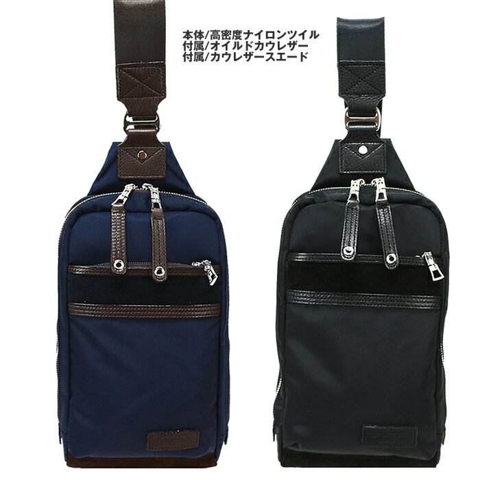 カラー ブラック、ネイビー 素 材 本体/高密度ナイロンツイル付属/オイルドカウレザー付属/カウレザースエード サイズ W17・H30・D5.5cm 生産国 made in japan 仕様内容 メンズ・レディース対応のボディ・ショルダーバッグ。