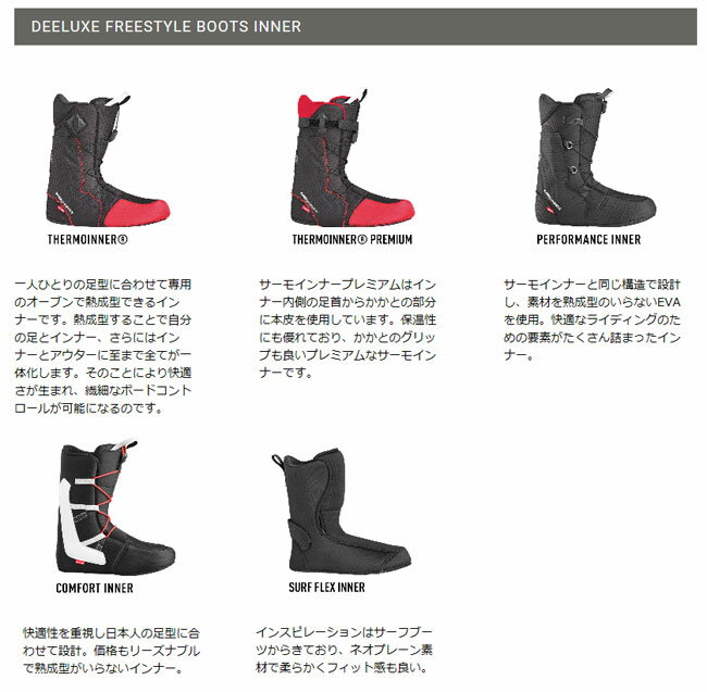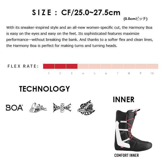 DEELUXEはこちらから □商品詳細 ■MODEL:HARMONY BOA CF ■小売希望価格:¥35,000+(税) ■インナー:COMFORTインナー -------------------------------- -スピードレースタイプ -レディースモデル -フレックス:SOFT -ジャンル別:グラトリ/ジブ/ジャンプ/パーク/フリーラン/サーフスタイル(地形遊び) -------------------------------- シングルのSCLレーシングシステムで簡単に締め上げることができるモデル。