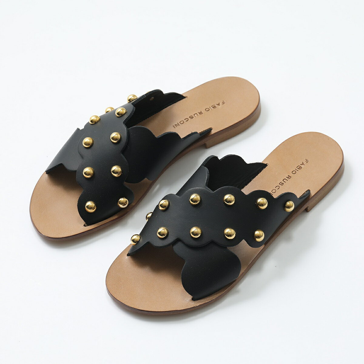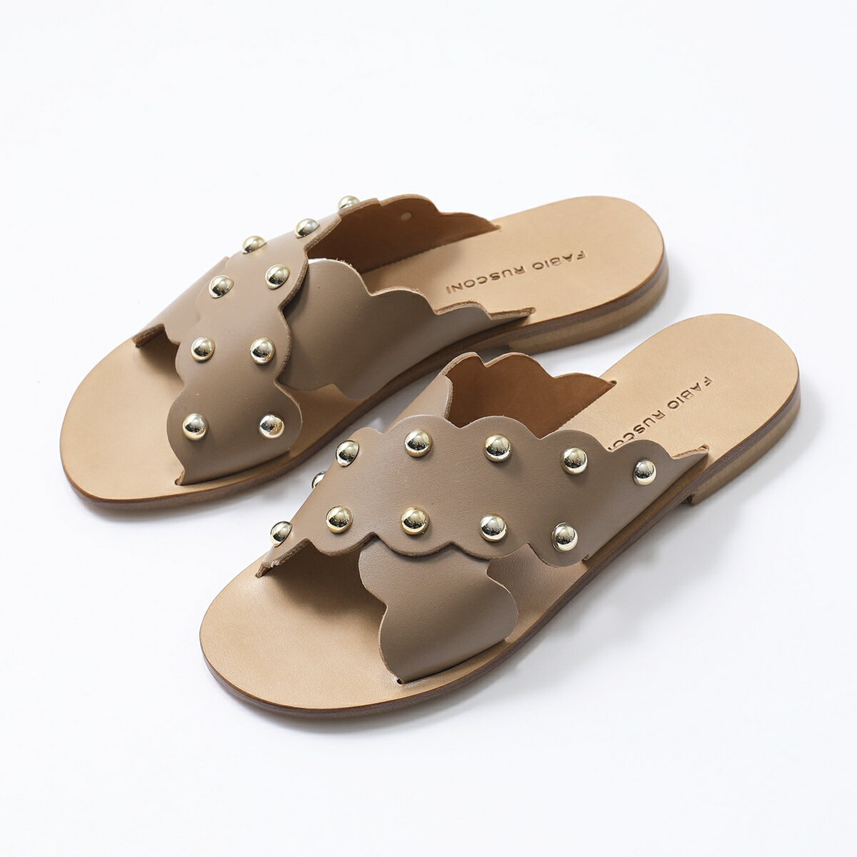 上質なスムースクロスレザーに存在感抜群の丸スタッズが装飾された、上品なフラットサンダル。